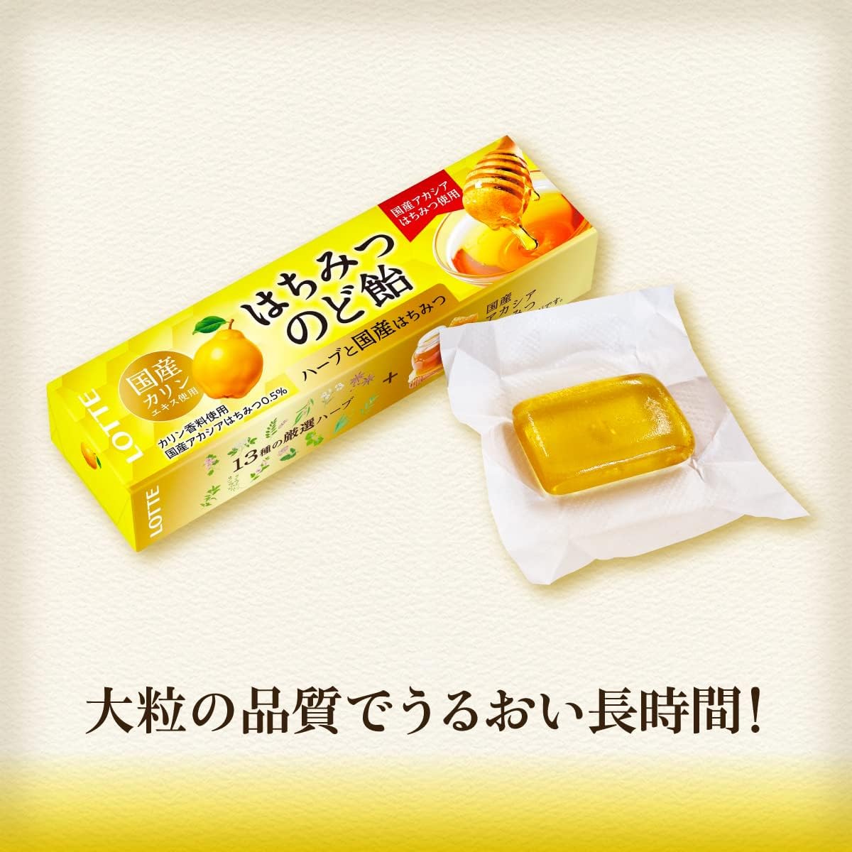 Balas para garganta da Lotte formuladas com extrato de marmelo e mel. O aroma adocicado do mel, aliado à refrescância natural, espalha-se pela boca, proporcionando alívio e bem-estar.